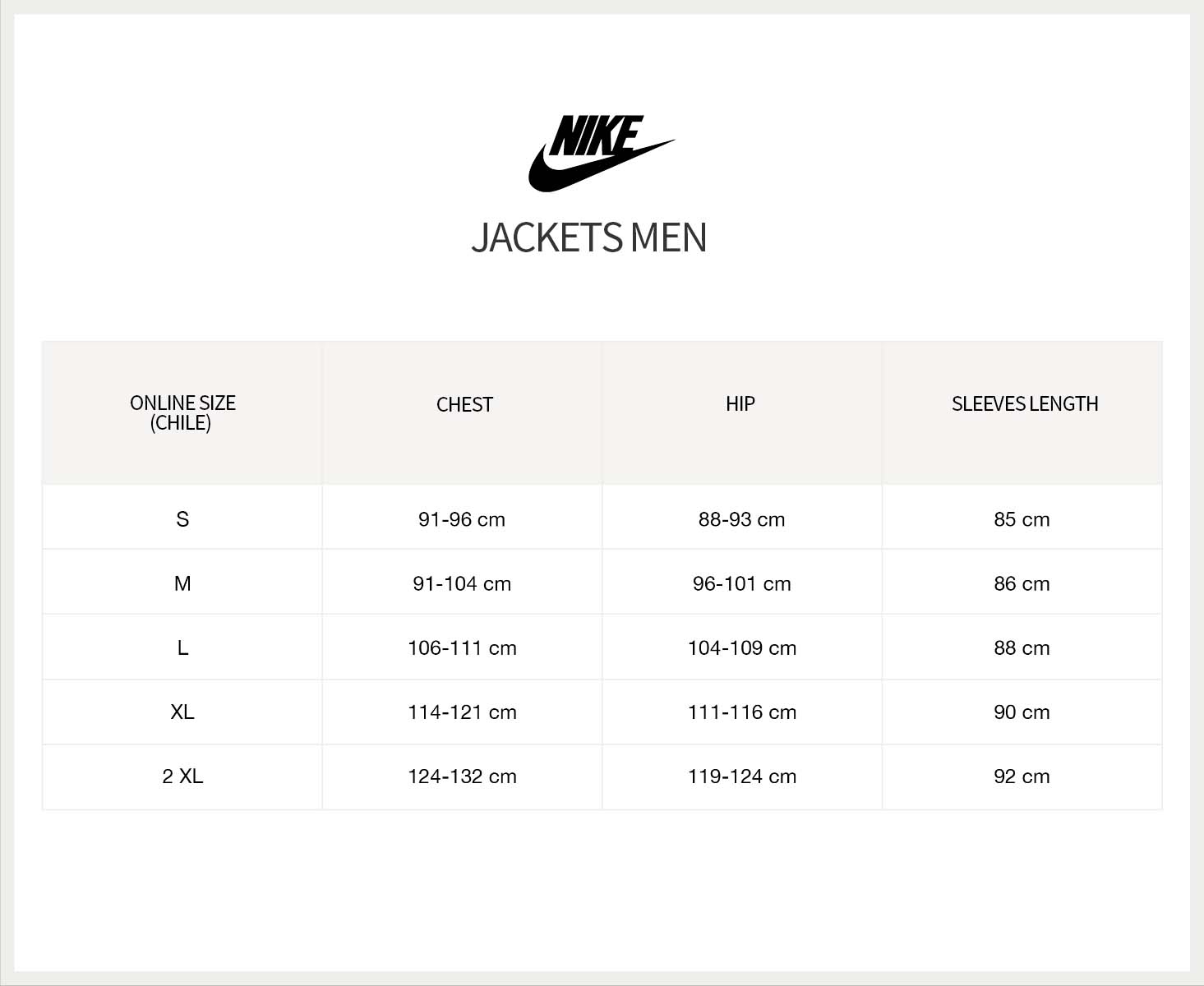Size Chart in Inches: