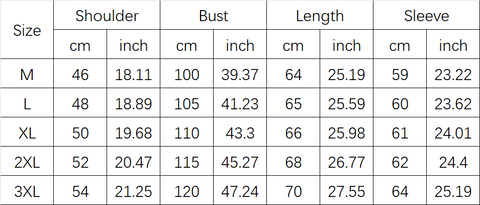 - Sleeve length (B): Measure from the shoulder to the wrist. \n